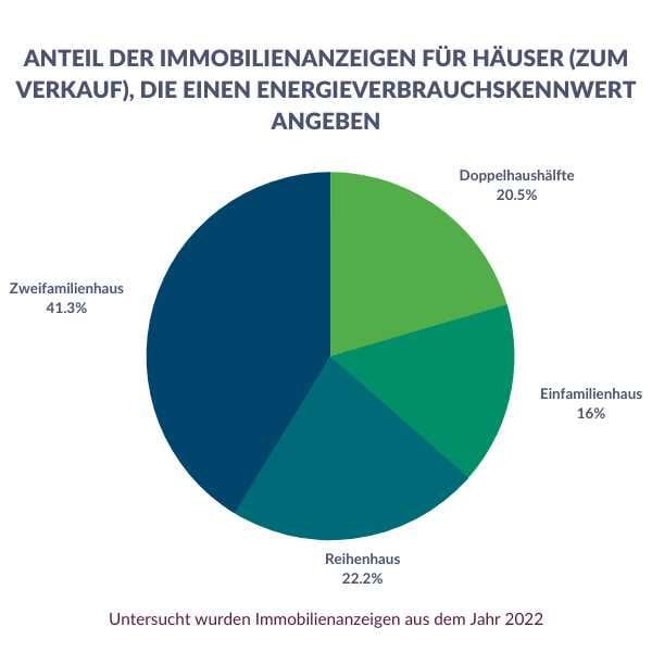 Für Zweifamilienhäuser war der Energieverbrauchskennwert immerhin in 39,7 Prozent der Inserate angegeben, für Reihenhäuser in 21,4 Prozent und für Doppelhaushälften in 19,7 Prozent. Das Schlusslicht bilden die Inserate für Einfamilienhäuser: Nur in 15,4 Prozent davon war der Energieverbrauchskennwert zu finden.