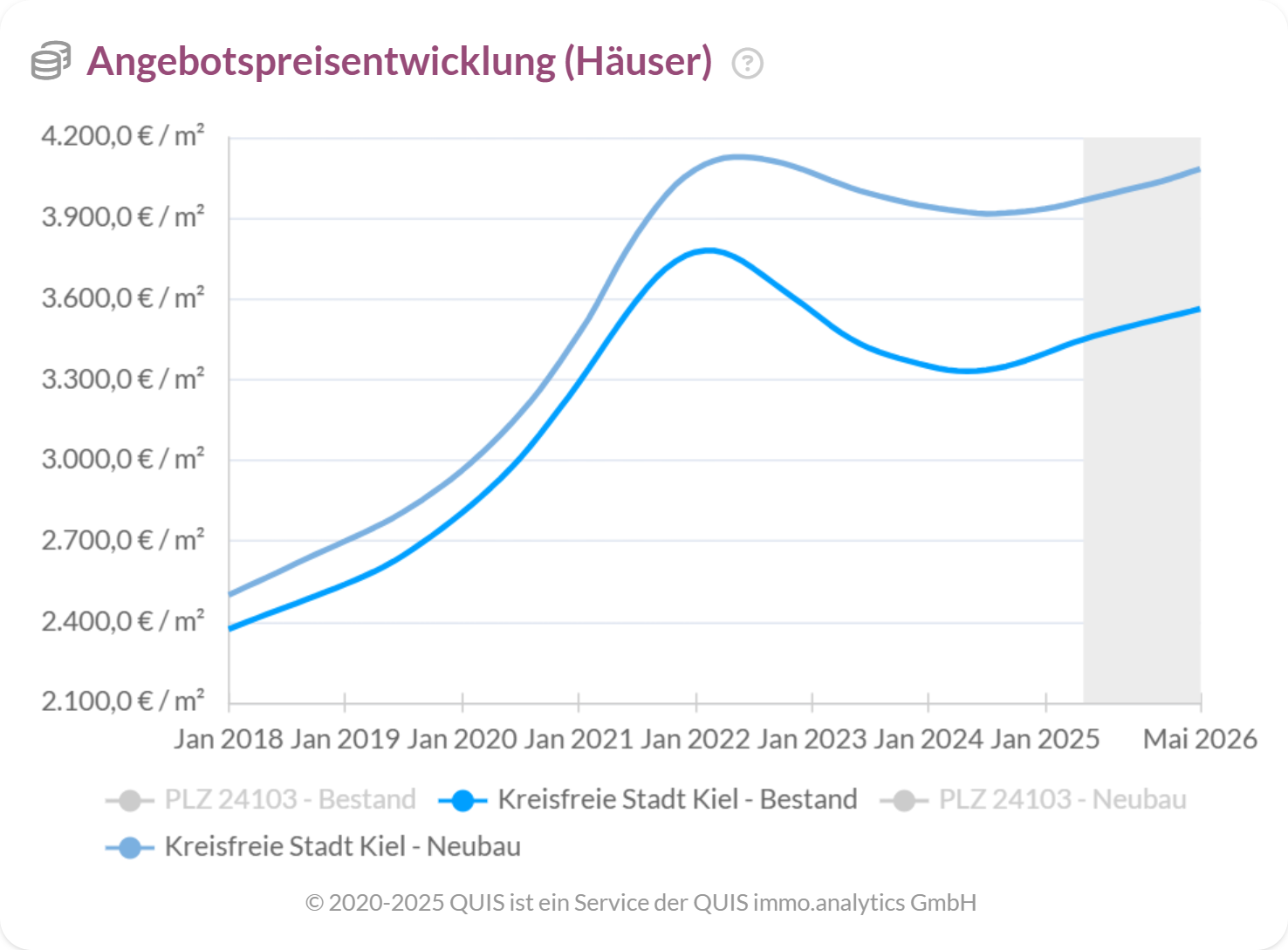 Der Immobilienmarkt in Bremen hat sich in den vergangenen Jahren merklich verändert – sowohl bei Miet- als auch Kaufobjekten. Die folgenden Auswertungen zeigen die Entwicklung der Angebotspreise, Mieten und Vermarktungsdauer für Wohnungen und Häuser...Die schleswig-holsteinische Landeshauptstadt Kiel weist mit ihrer maritimen Lage, ihrer Universität und ihrem starken Wirtschaftsstandort weiterhin eine hohe Attraktivität auf. Das spiegelt sich auch auf dem Immobilienmarkt wider. Wir werfen einen datenbasierten Blick auf Mieten, Kaufpreise und Vermarktungsdauern und geben einen Ausblick auf weitere Entwicklung.