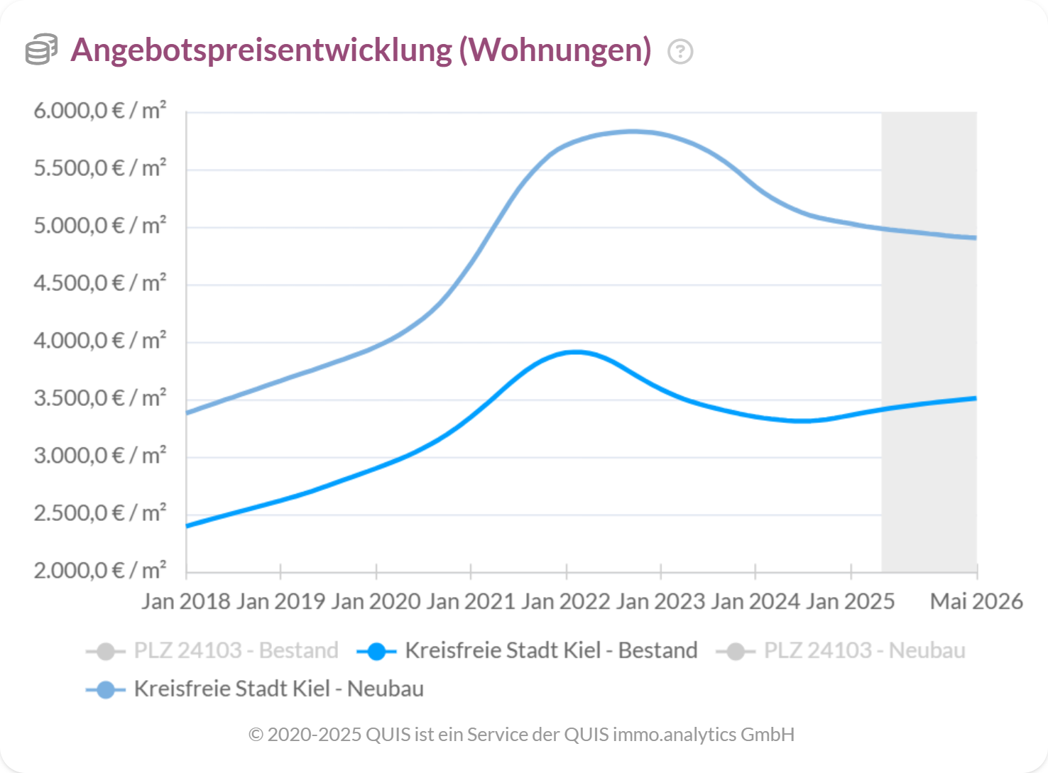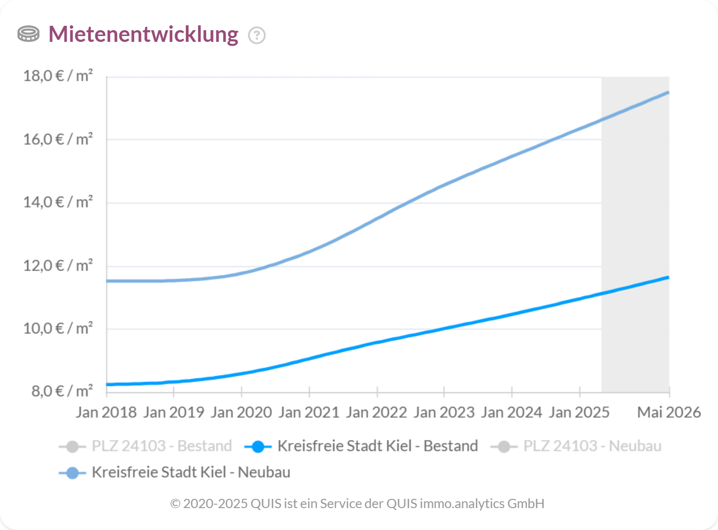 Die Angebotsmieten in Kiel sind in den letzten Jahren spürbar gestiegen – sowohl im Bestand als auch im Neubau.