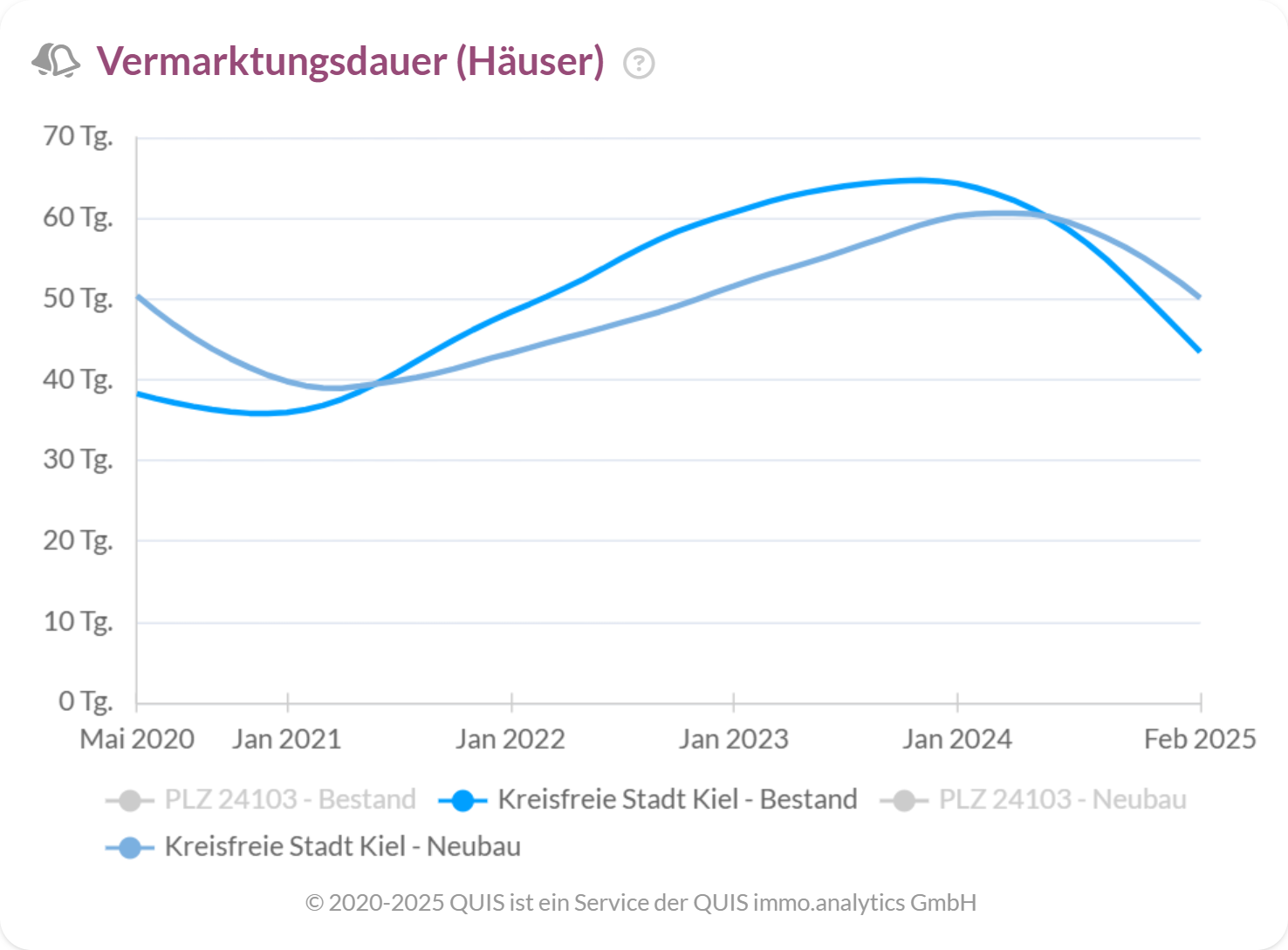 Die Vermarktung von Häusern nahm zuletzt wieder weniger Zeit in Anspruch: Im Februar 2025 liegt sie bei 43,4 Tagen im Bestand und 50,1 Tagen im Neubau. Noch 2024 betrug die durchschnittliche Dauer teilweise über 60 Tage. Das könnte auf eine leichte Marktbelebung hindeuten.