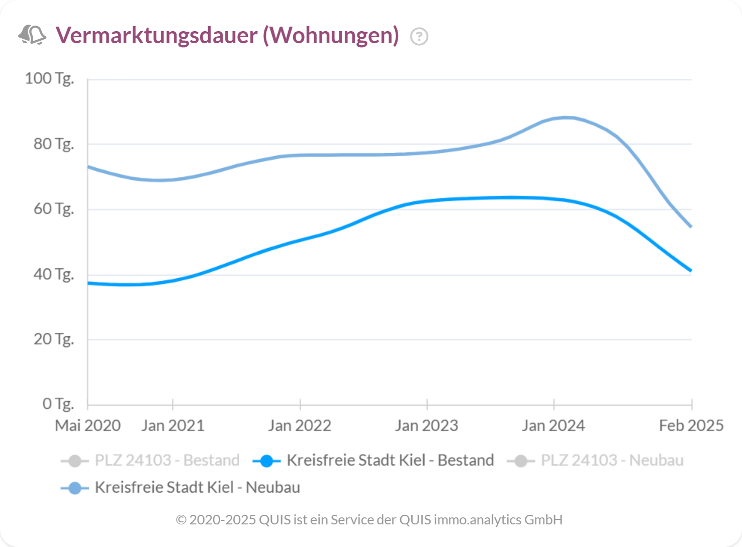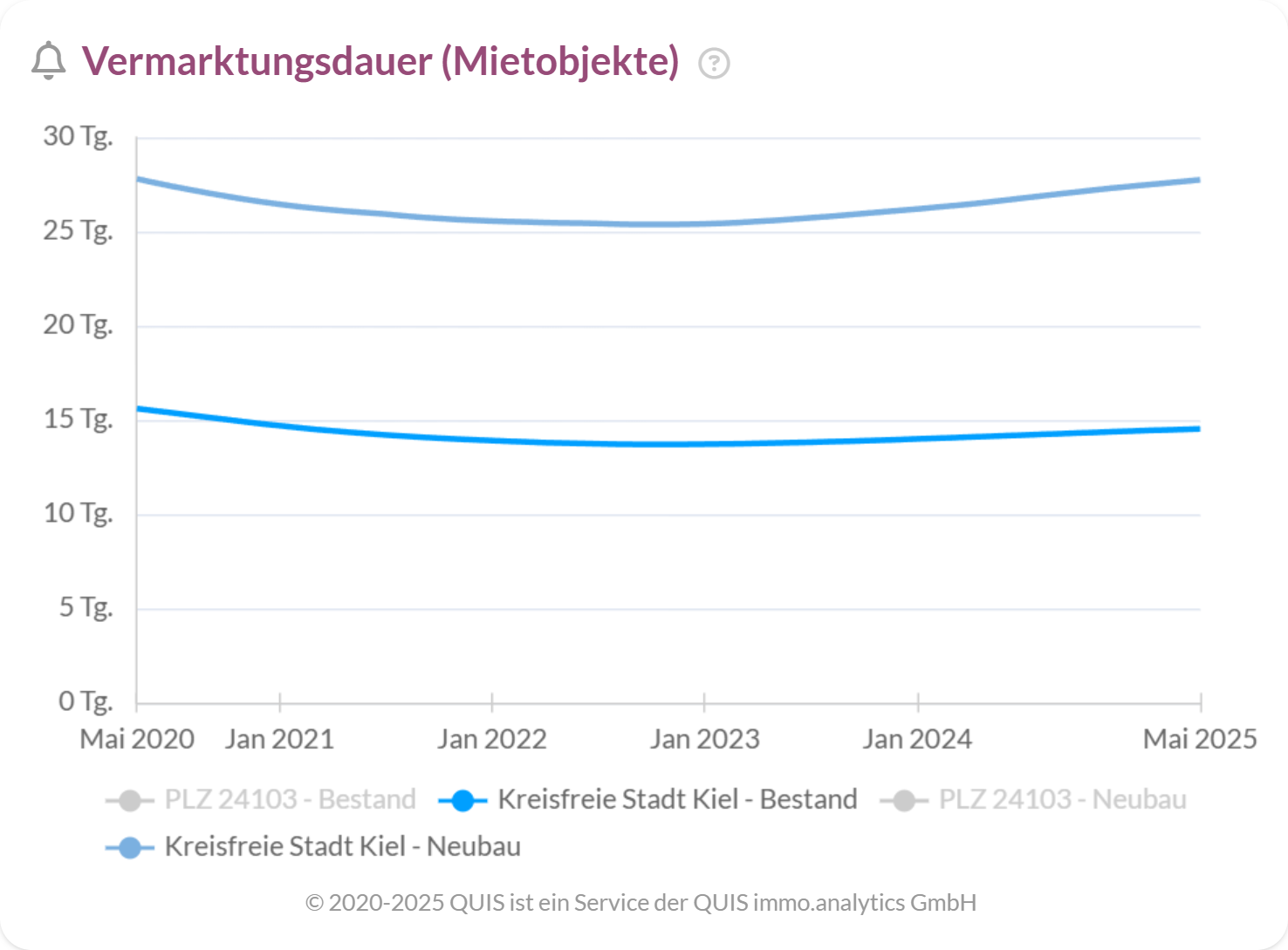Die Vermarktungsdauer von Mietwohnungen bleibt in Kiel gering. Für Bestandswohnungen liegt sie 2025 bei rund 14,5 Tagen, für Neubauten bei 27,8 Tagen und damit ähnlich hoch wie im Jahr 2020. Auch diese Werte weisen auf eine nach wie vor angespannte Situation auf dem Mietmarkt hin.