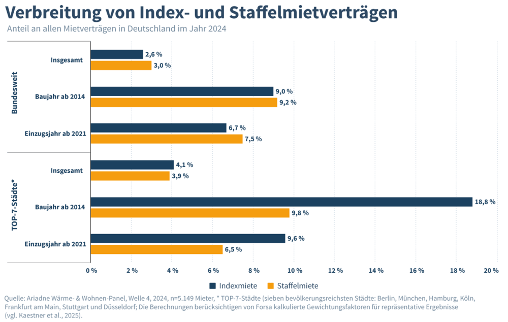 Institutionelle Großvermieter mit ca. 14 % Marktanteil nutzen etwas häufiger Index- und Staffelmietverträge, besonders in Neubauten und Ballungsgebieten, um Mieterträge nachhaltig planen zu können.