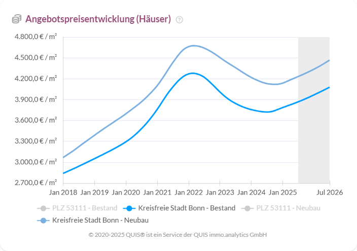 - Bestandshäuser kletterten von 2.839 €/m² im Januar 2018 auf 3.854 €/m² im Juni 2025. Für Juli 2026 wird ein weiterer Anstieg auf 4.078 €/m² erwartet.