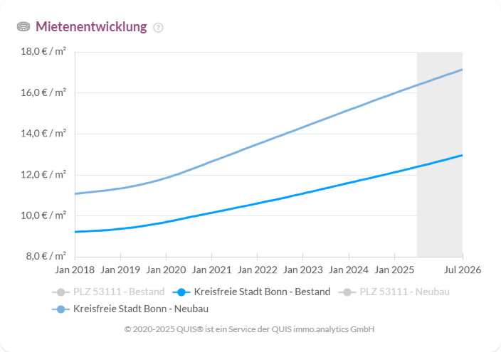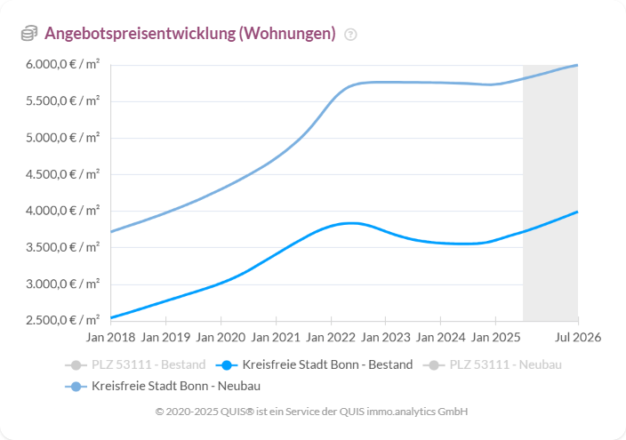 Wie entwickeln sich Mieten und Kaufpreise in Deutschland? Der neue QUIS Wohnungsmarktreport Juli 2025 liefert fundierte Einblicke in die aktuelle Marktsituation, regionale Besonderheiten und Trends. Jetzt informieren und Report kostenlos...Als ehemalige Bundeshauptstadt und Sitz mehrerer UN-Organisationen zieht Bonn ein internationales Klientel an; dies stabilisiert die Nachfrage nach hochwertigen Bestands- und Neubauwohnungen.