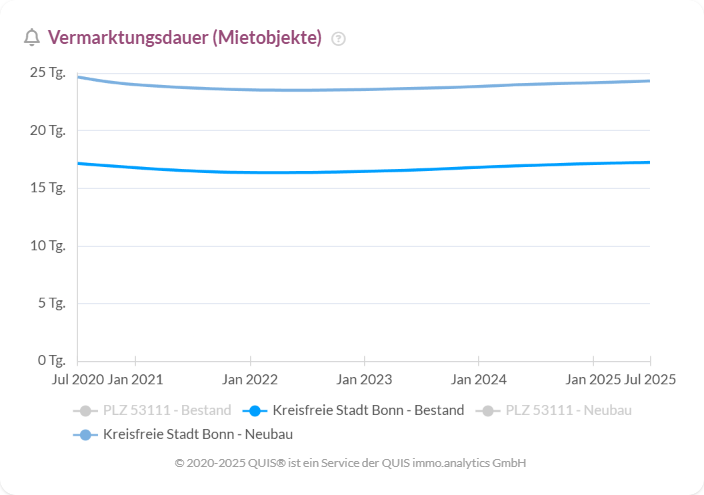 Die Vermarktungsdauer von Mietobjekten in Bonn bewegt sich seit mehreren Jahren auf einem konstant niedrigen Niveau.
