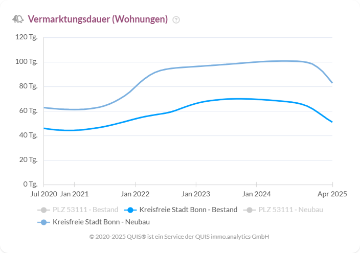 Die Vermarktungsdauer für Eigentumswohnungen in Bonn hat sich in den letzten Jahren insgesamt eher wenig verändert.