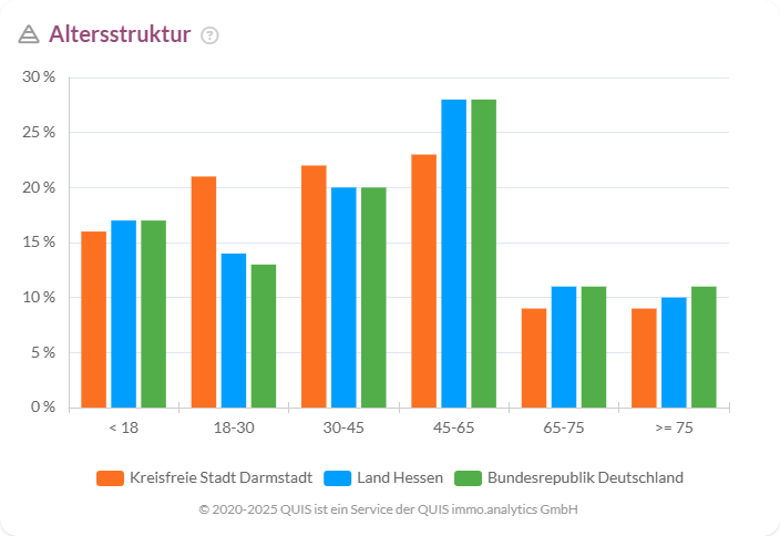Die Alters- und Haushaltsstruktur in Darmstadt unterscheidet sich deutlich von Hessen und Deutschland insgesamt. Besonders auffällig ist der hohe Anteil an jungen und jüngeren Erwachsenen zwischen 18 und 45 Jahren, während die Altersgruppen über 65 Jahren unterrepräsentiert sind. Hier macht sich deutlich bemerkbar, dass Darmstadt eine Universitätsstadt ist: rd. 37.000 Studierende an 6 Hochschulen machen allein 23 % der Bewohner aus.