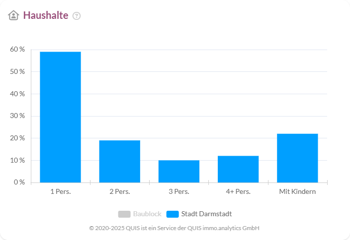 Die Haushaltsstruktur bestätigt diesen Trend: Mehr als die Hälfte aller Haushalte sind Ein-Personen-Haushalte, während größere Haushalte mit drei oder mehr Personen deutlich seltener sind. Auch der Anteil an Haushalten mit Kindern ist vergleichsweise niedrig. Dies spricht für eine hohe Nachfrage nach kleinen Wohnungen und zeigt, dass Darmstadt besonders für Singles, Studierende und Berufseinsteiger attraktiv ist.