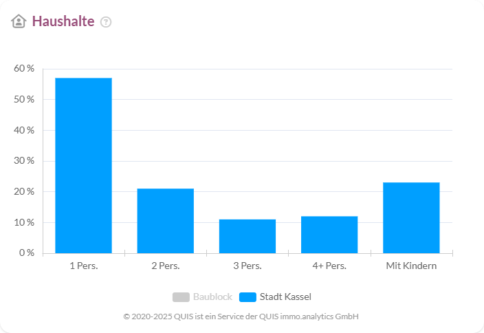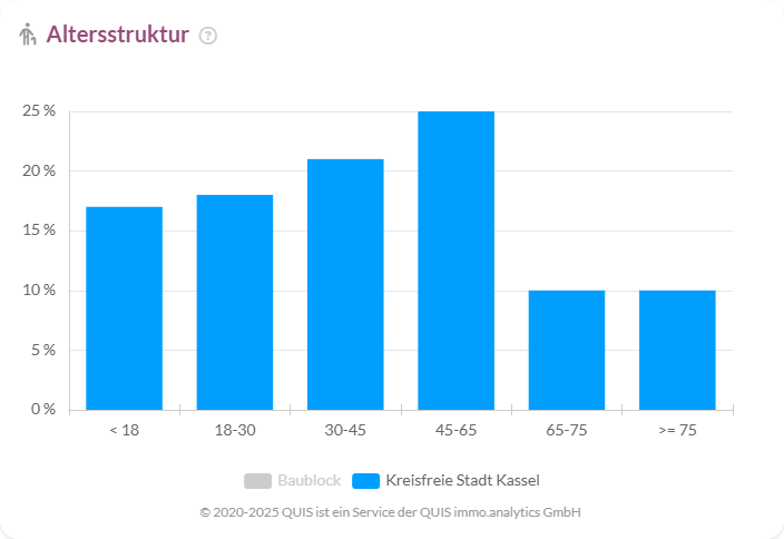 Die Haushaltsstruktur in Kassel zeigt eine deutliche Dominanz von Einpersonenhaushalten, die fast 60 % aller Haushalte ausmachen. Haushalte mit Kindern sind im Vergleich weniger häufig vertreten, was die Nachfrage nach kleineren Wohnungen unterstreicht. In der Altersstruktur sticht die Altersgruppe der 45- bis 65-Jährigen hervor, die etwa 25 % der Bevölkerung ausmacht, gefolgt von den 30- bis 45-Jährigen. Jüngere Altersgruppen (< 18 und 18-30 Jahre) sind ebenfalls signifikant vertreten, während die Gruppen ab 65 Jahren einen geringeren, aber nicht unbedeutenden Anteil stellen.