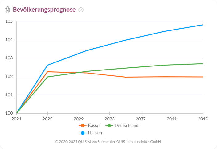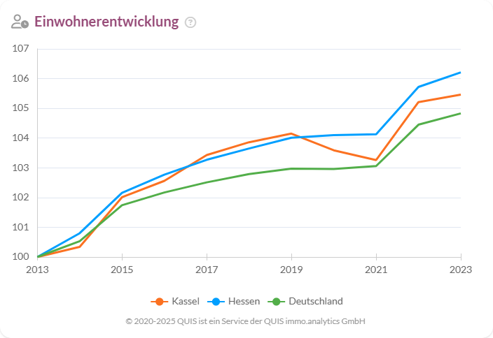Kassel hat in den letzten Jahren ein beeindruckendes Bevölkerungswachstum verzeichnet. Zwischen 2013 und 2023 stieg die Einwohnerzahl um rund 6 %. Die Prognosen zeigen jedoch, dass sich dieses Wachstum in den kommenden Jahren nicht fortsetzen wird, sondern in eine Seitwärtsbewegung übergeht.