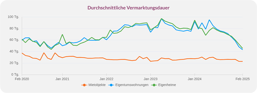 Die Vermarktungsdauer für Mietwohnungen blieb nahezu konstant (22 Tage), während Kaufimmobilien im Schnitt 26,2 Tage schneller verkauft wurden.